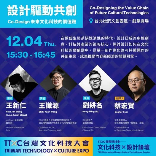 (五)內容介紹:在生成式AI、沉浸式內容與數位生態系快速演進的時代,設計已不僅是美學的語言,更成為串連創意、科技與產業的策略核心。本講座以「設計驅動共創」為主題,探討設計如何在文化科技的價值鏈中,從單一創作進化為可持續運作的共創生態,成為推動內容新經濟的關鍵引擎。
