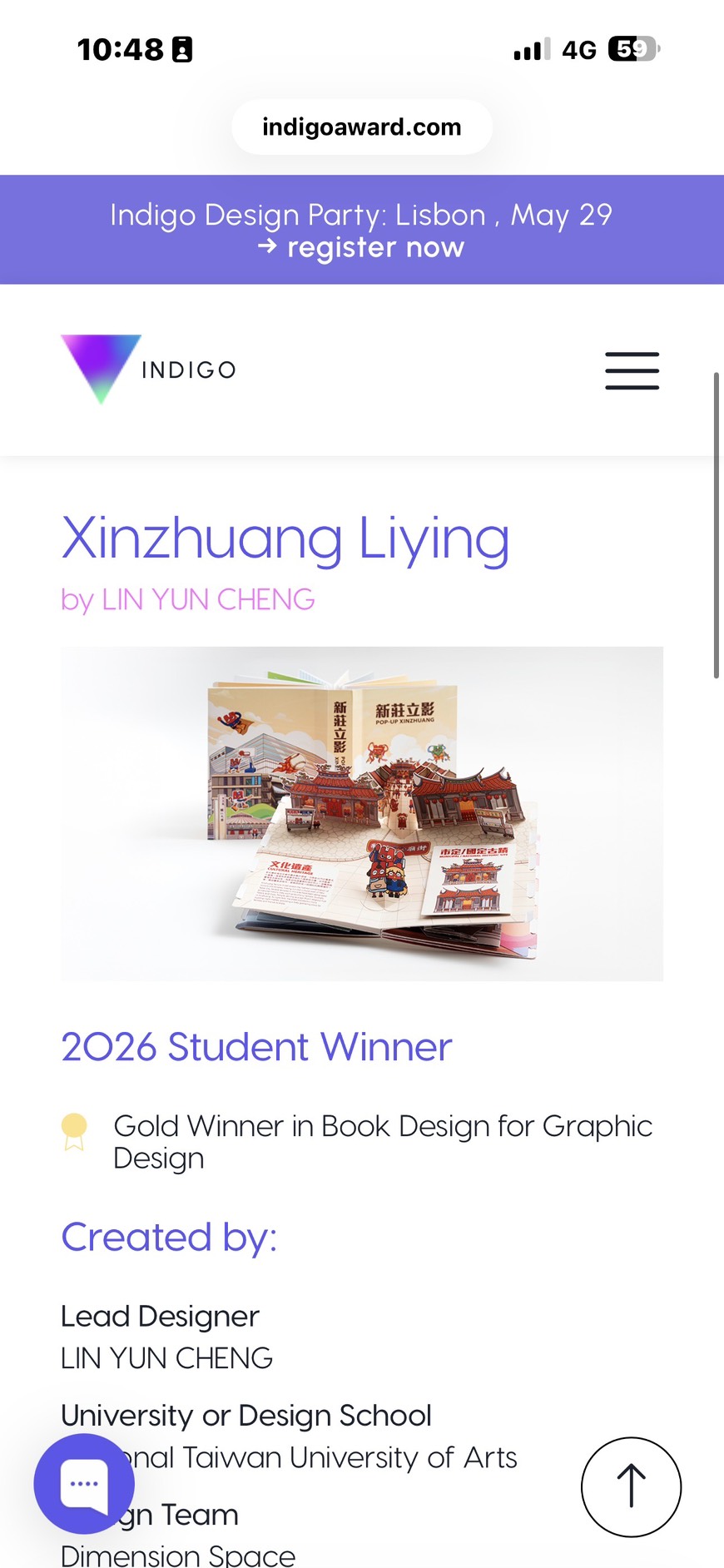 輔仁大學文創學程畢業生林允丞再傳捷報!其立體書作品《新莊立影》在國際頂尖賽事「2026 Indigo Design Award」中脫穎而出,勇奪書籍設計類金獎。